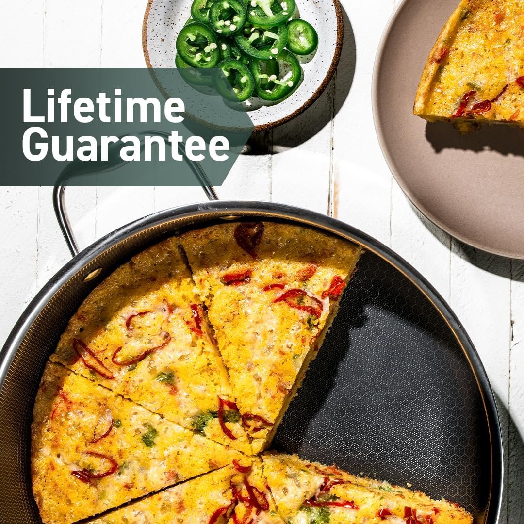 ผลิตภัณฑ์ HexClad ที่จำหน่ายโดย HexClad Cookware รับประกันตลอดอายุการใช้งานจากข้อบกพร่องของผู้ผลิต (ยกเว้นการใช้งานเชิงพาณิชย์และร้านอาหาร)