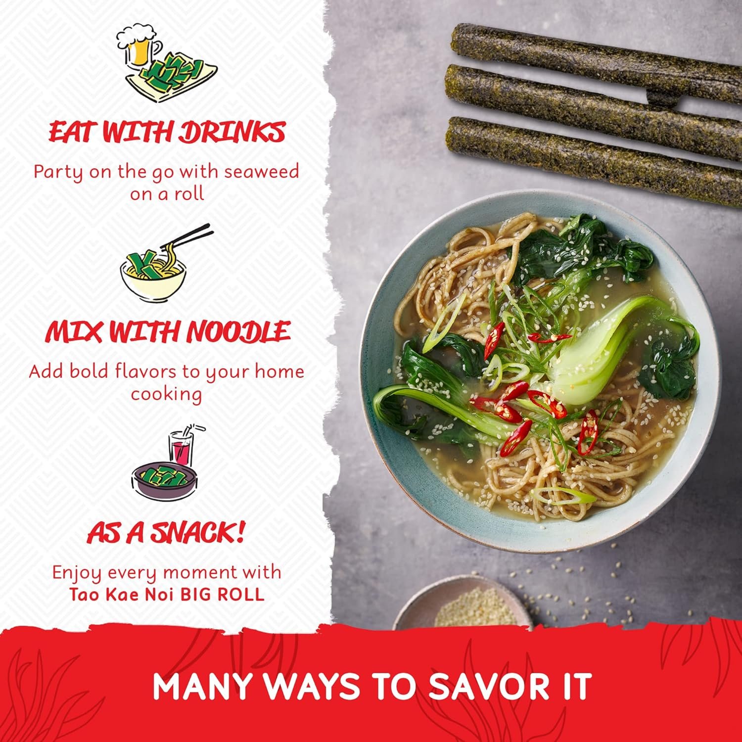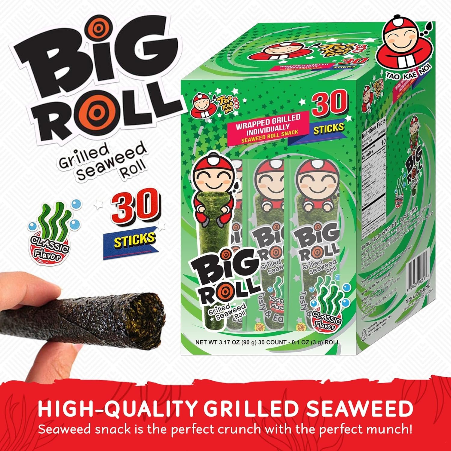 ขนมสาหร่ายนี้มีรสชาติคลาสสิกต้นตำรับที่ติดใจคุณจนอยากทานอีก โรลสาหร่าย Tao Kae Noi มีรสชาติเข้มข้นและเปรี้ยวจี๊ด เติมความแปลกใหม่ให้กับเมนูต่าง ๆ เช่น สลัด ราเมน หรือทรีลมิกซ์สไตล์เอเชีย เตรียมตัวพบกับรสชาติที่ท้าทายได้เลย!