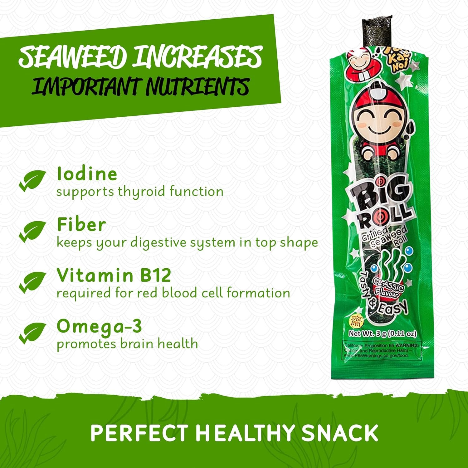 ต้องการขนมที่ดีต่อสุขภาพไหม? ขนมสาหร่าย Tao Kae Noi เป็นทางเลือกอร่อยที่ช่วยเพิ่มสารอาหารสำคัญจากสาหร่าย เช่น ใยอาหาร, โอเมก้า 3 และไอโอดีน ทุกอย่างรวมอยู่ในแพ็กเกจเดียว! โรลแต่ละชิ้นมีแคลอรี่เพียง 10 กิโลแคลอรี่ ไม่มีไขมันทรานส์ และมีไขมันและคอเลสเตอรอลต่ำ ให้คุณเพลิดเพลินกับขนมที่ทั้งอร่อยและดีต่อใจ