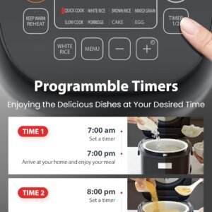 ใช้งานง่าย – ออกแบบมาพร้อมแผงควบคุมที่ใช้งานง่าย พร้อมจอแสดงผล LED ขนาดใหญ่เพื่อการตั้งโปรแกรมที่รวดเร็วและง่ายดาย ฟังก์ชันอุ่น/อุ่นซ้ำช่วยให้ข้าวของคุณอุ่นและอร่อยได้นานหลายชั่วโมง ตัวตั้งเวลาหน่วง 2 ตัวช่วยให้คุณตั้งเวลาหุงล่วงหน้าได้สูงสุด 24 ชั่วโมง อุปกรณ์เสริม: ถ้วยตวง, ตะหลิว และทัพพีตักซุป